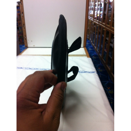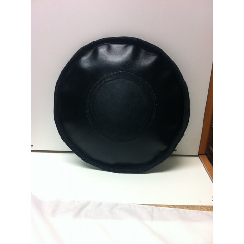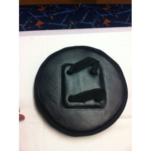 This dhal is made of leather. It weighs 0.83lbs. It has 2 straps at the back to grasp it securely. It is 10'' in diameter.