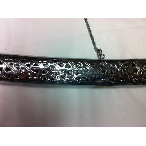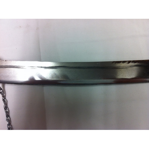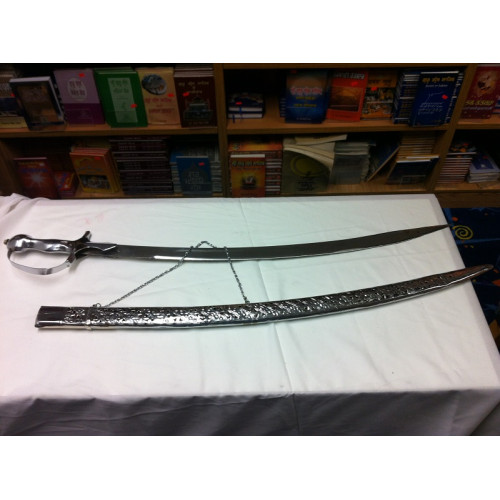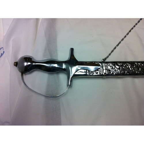 This Kirpan's Mayaan(Sheath) is made of a silver coloured covering with a chain. The blade and handle are both metal.