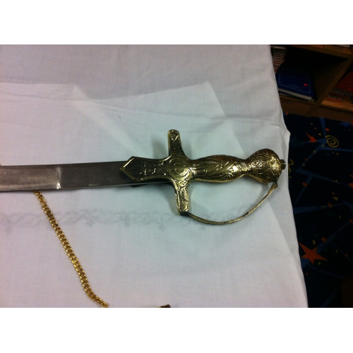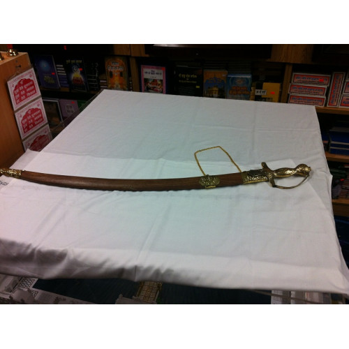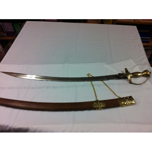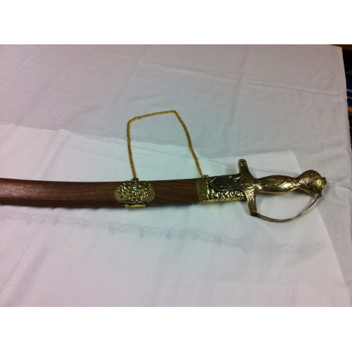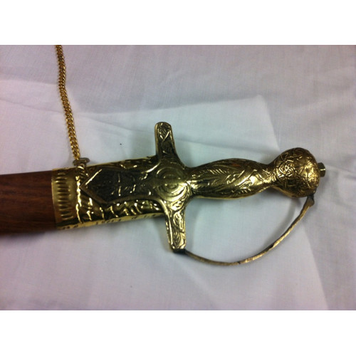 The Sheath is made of wood while the golden handle and blade are Sarbloh(Iron). The Sheath has a golden chain on it as well.