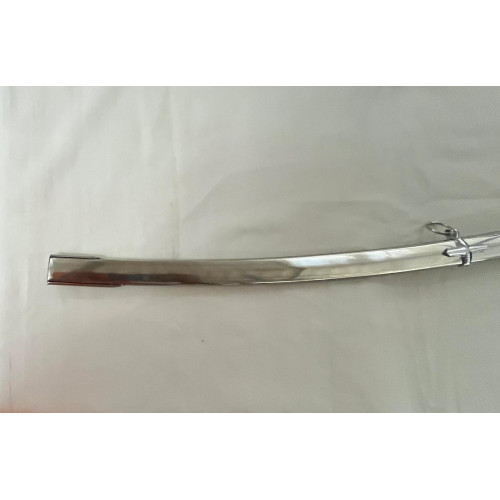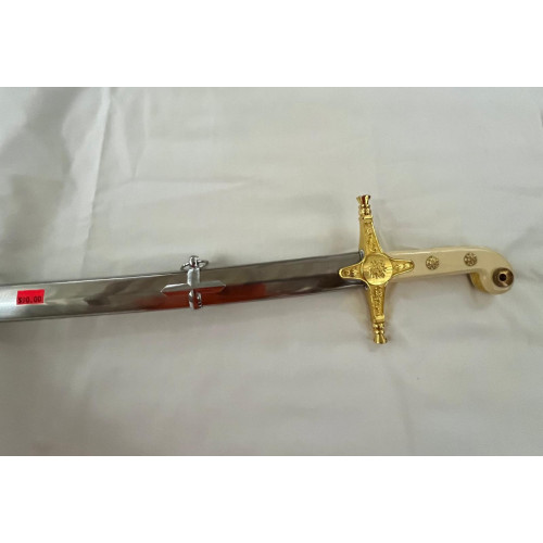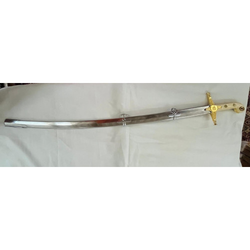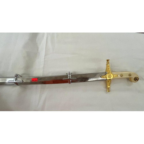 THIS KIRPAN HAS SILVER METALLIC MAYAAN(SHEATH) AND OFF- WHITE HANDLE HAS GOLDEN METALLIC DESIGN ON IT.
