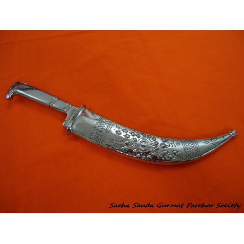 Engraved Stainless Steel Sheathe, Non-Rusting Iron Handle and Blade. Blade has "Panth Kee Jeet" engraved in Punjabi on it