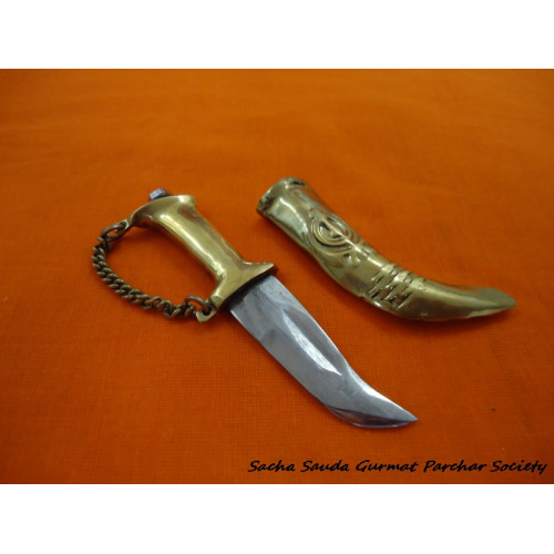 Brass Chain Handle and Sheathe, Stainless Steel Blade. Sheathe has Khanda etched on it