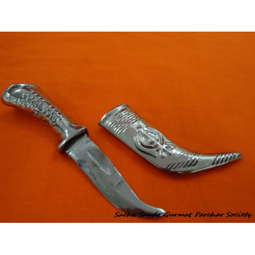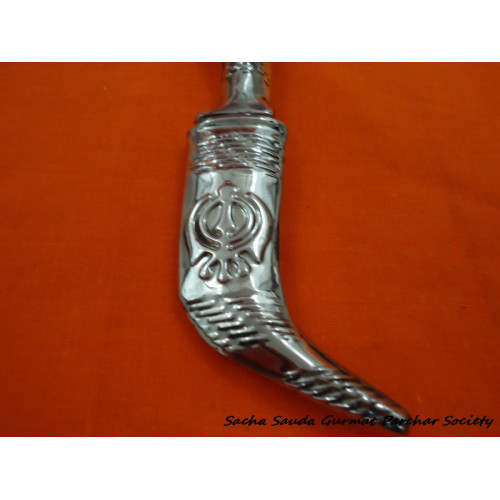 Stainless Steele Handle and Sheathe. Sheathe has Khanda etched on it. Blade is Non-Rusting Iron