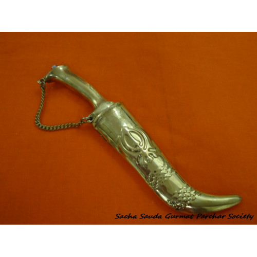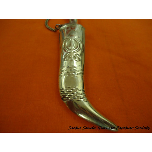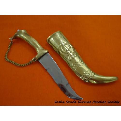 Brass Chain Handle and Sheathe. Sheathe has Khanda etched on it. Blade is Stainless Steele.